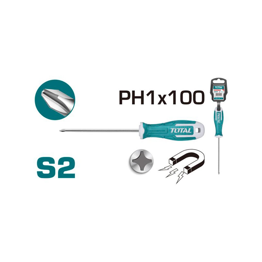 1 chave de fenda com 1 cabide de plástico, S2, PH1, haste redonda, Diâmetro: 5,0 mm, comprimento: 100 mm.