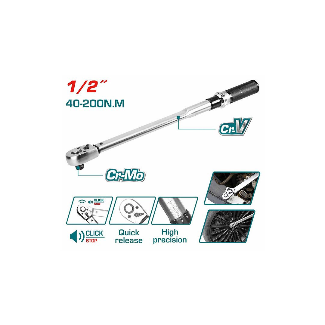 Tamanho: 1/2″, Comprimento: 500 mm, Faixa de torque: 40-200 Nm, Tolerância de torque ±4%, Material: Cr-V+Cr-Mo, Material do cabo: alumínio, Design de fácil ajuste de torque.
