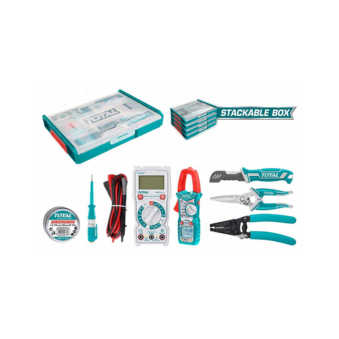 1 lápis de teste, 190 mm, 1 pc Tesoura de eletricista , 7 polegadas, 1 alicate amperímetro digital, 1 faca de decapagem de cabos, 1 fita isolante de PVC, 18 mm x 9,15 m, 1 alicate de decapagem de fios, 7,5 polegadas, 1 multímetro digital.