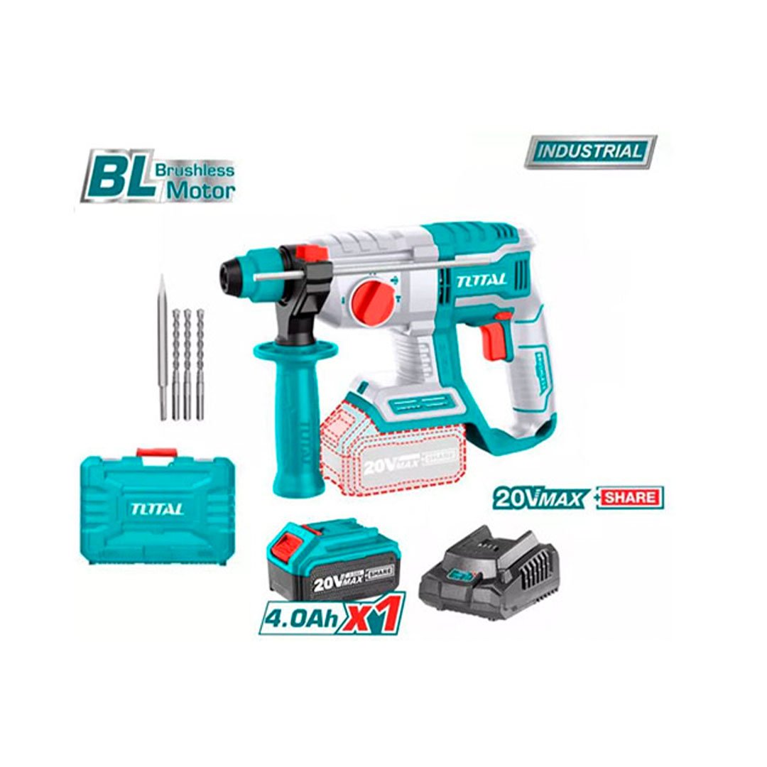 Voltagem: 20 V. Velocidade: 0-1100 rpm. Número máximo de batidas: 0-5400 batidas por minuto, Força de impacto: 2,0 J, Luz de trabalho embutida., Sistema de cartucho SDS Plus.