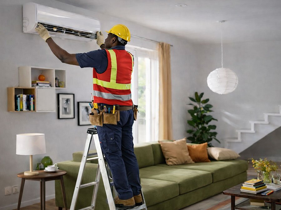 O serviço é executado por técnico qualificado, garantindo correta fixação, ligação e testes de funcionamento, assegurando desempenho eficiente e seguro do equipamento.